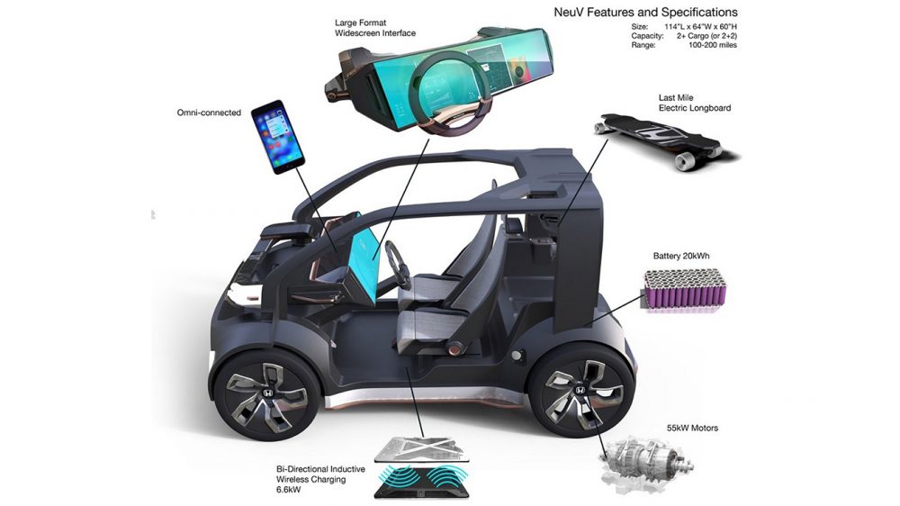 İki kişinin seyahat edebileceği tasarıma sahip NeuV’da, 55 kW‘lık elektrik motoru görev yapıyor. Honda, NeuV’un 20 kWh‘lık bataryasıyla kullanım durumu ve yol şartlarına göre 160 ile 321 km aralığında bir menzil değerine sahip olduğunu açıkladı ki bu değelerin kullanım alanı düşünüldüğünde gerçekten başarılı olduğunu söylemek gerekiyor. NeuV’un kablosuz şarj desteğinin de olduğunun altını çizmekte fayda var. Honda NeuV ile birlikte kullanıcılara “Last Mile” adını verdiği bir adet elektrikli kaykayı da sunuyor.