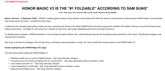 FIA 2024 etkinliği kapsamında küresel olarak tanıtılan Honor Magic V3, katlandığı zaman sadece 9,3 mm kalınlığında bir model. Rakip Galaxy Z Fold 6’dan neredeyse 3 mm daha ince olan telefon, bu konuda gerçekten sınırları zorluyor. Ulaştığı bu incelik seviyesini öne çıkarmak adına Samsung’a sık sık takılan şirket, rakibine bu sefer “Sam Sung” isimli kişiler üzerinden gönderme yaptı. Adı Sam, soyadı ise Sung olan kişilerin ağzından telefonu öven mesajlar paylaşan şirket, geçtiğimiz hafta çok daha ilginç bir adım atmıştı. Şirket, Magic V3’ün menteşesine dünyanın en küçük özür mesajını yazmıştı. Burada Magic V3’ün üstün yanları öne çıkarılarak Galaxy Z Fold kullanıcılarından özür dilendi. Şirket menteşeye Graham Short’un desteğiyle şunları yazdı: “Sevgili Samsung Galaxy Z Fold sahipleri, üzgünüz. Muhtemelen şu anda Magic V3’e bakıyor ve biraz ihanete uğramış hissediyorsunuz. Acınızı anlıyoruz.