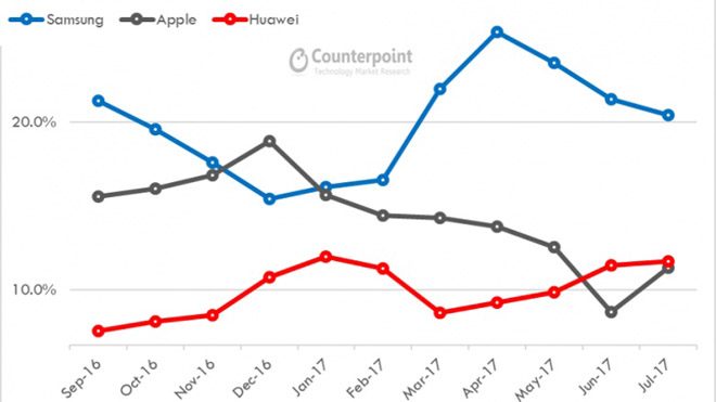 Araştırma şirketi Counterpoint Research akıllı telefon pazarındaki rekabetin haziran, temmuz aylarında yeni bir oyuncuyla seyir değiştirdiğini açıkladı. Global telefon satışlarında Samsung ve Apple arasındaki rekabet son tüketicinin dahi hissedebildiği bir durum. Global satış grafiğine göre Apple ve Samsung arasındaki bu rekabet ise Eylül 2016 – Temmuz 2017 arasında bir kez yer değiştirmiş o da kasım – aralık aylarında Apple’ın liderlik koltuğuna oturmasıyla olmuş. Ki düşününce eylül gibi gerçekleşen lansman sonrası global satışlarda ani bir artış oldukça normal. Fakat grafiğin devamı daha da ilginç. Samsung global satışlarda tekrar zirveye otururken Apple satışları düşüyor ve sessizce ilerleyen Huawei beklenmedik bir anda Apple’ı geçiyor.