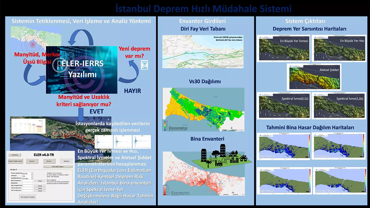“İBB Deprem ve Zemin İnceleme Müdürlüğü ile Boğaziçi Üniversitesi Kandilli Rasathanesi, Deprem Araştırma Enstitüsü, Deprem Mühendisliği Ana Bilim Dalı arasında gerçekleştirilen bu çalışma ile İstanbul Deprem Acil Müdahale ve Erken Uyarı Sisteminin genel nitelikleri tariflenmiş ve algoritması şematize edilerek açıklanmıştır. Sistemin Türkiye’deki ve başka ülkelerdeki kentsel deprem izleme sistemleriyle kıyaslaması teknolojik, yönetsel ve hukuki bileşenler dikkate alınarak yapılmıştır. Sistemin kullanımının fayda sağlayacağı kritik kentsel altyapı hizmetlerindeki (su, elektrik, gaz, ulaşım vb.) mevcut ihtiyaçların analiz edilmesi, gerekli standartların tariflenmesi ve bu kapsamda İstanbul Deprem Acil Müdahale ve Erken Uyarı Sisteminin söz konusu ihtiyaçları karşılamasına veya mevcut kentsel altyapı hizmetlerinin sistem ile uyumunun sağlanmasına yönelik eylemler tanımlanmıştır.”