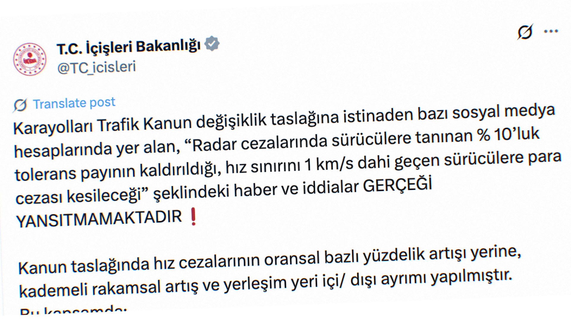 Bakanlıktan yapılan resmi açıklamada şunlara yer verildi: “Karayolları Trafik Kanun değişiklik taslağına istinaden bazı sosyal medya hesaplarında yer alan, “Radar cezalarında sürücülere tanınan % 10’luk tolerans payının kaldırıldığı, hız sınırını 1 km/s dahi geçen sürücülere para cezası kesileceği” şeklindeki haber ve iddialar gerçeği yansıtmamaktadır. Kanun taslağında hız cezalarının oransal bazlı yüzdelik artışı yerine, kademeli rakamsal artış ve yerleşim yeri içi/ dışı ayrımı yapılmıştır. Bu kapsamda; yerleşim yerlerinde 50 km/s olan hız sınırında % 10 tolerans uygulanarak ilk kademe cezası 56 km/s üzerinden verilmektedir. Yeni yapılan düzenlemede de yerleşim yerlerinde ilk kademe cezası 56 km/s üzerinden başlamaktadır. Halen mevcut mevzuatta yerleşim yeri dışındaki iki yönlü karayollarında 90 km/s hız sınırına %10 tolerans uygulanmaktadır. Yeni yapılan düzenlemede de yerleşim yeri dışındaki iki yönlü karayolundaki ilk kademe hız cezası için 10 km/s tolerans öngörülmüştür. Sonuç olarak hız ile ilgili yerleşim yeri içerisinde 5km/s; yerleşim yeri dışındaki 10 km/s ilk aşım tolerans uygulaması devam etmektedir. Kamuoyuna saygıyla duyurulur.”