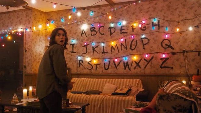 Stranger Things cephesinde ise Joyce Byers’ın salonuna konuk oluyoruz elbette. Birinci sezonda Upside Down’da sıkışıp kalan küçük oğlu Will ile iletişim kurabilmek için yılbaşı ışıkları ve duvara çizilmiş alfabeden yararlanan Byers’ın rahat ve sıcak salonu da sehpa üzerindeki mum detayına kadar düşünülmüş.