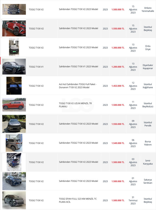 Türkiye’deki büyük satış platformlarında şu an çok sayıda Togg T10X ilanı listeleniyor. 16 Ağustos 2023 itibarıyla spesifik olarak Sahibinden üzerinde “18” farklı T10X ilanı yer alıyor. Sahibinden platformunda aracın fiyatı 1 milyon 624 bin TL ile 1 milyon 450 bin TL arasında değişiyor. Bir diğer büyük platform Arabam üzerinde ise 16 Ağustos 2023 itibarıyla “12” farklı T10X ilanı yer alıyor. Burada ise fiyatlar 1 milyon 563 bin TL ile 1 milyon 200 bin TL arasında değişiyor. Bu arada T10X için resmi teslimatlar da sürüyor, hatta bu konuda firmadan en son şu açıklama gelmişti: “Temmuz ayı içerisinde 627 adet teslimat gerçekleştirerek toplamda 1.435 adet T10X’i kullanıcılarımızla buluşturduk. Elektrikli C-SUV segmentinde liderliğimizi pekiştirdik.” Teslimatlar konusunda geçtiğimiz ay gelen açıklama ise şöyle olmuştu: “Bir otomobilden fazlası” hedefiyle çıktığı yolda Türkiye’nin doğuştan elektrikli ilk akıllı cihazı T10X’i kullanıcılarla buluşturmaya devam eden Togg, sadece iki ayda gerçekleştirdiği satışlarla elektrikli SUV segmentinde pazar lideri olma başarısını gösterdi. Togg, mayıs ve haziran aylarında 808 adet T10X’i kullanıcılara teslim ederek, elektrikli C-SUV segmentinde yüzde 28,9’luk payla pazar lideri oldu. T10X, toplam elektrikli SUV pazarında da yüzde 15’lik pazar payı ile haziran sonu itibarıyla liderliğe yerleşti.”