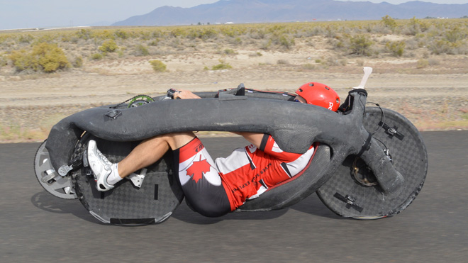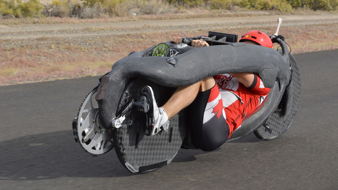 İlk bakışta ne olduğunu anlayamamış olabilirsiniz ancak habere konu olan roket görünümlü bu araç insan gücüyle hareket eden dünyanın en hızlı bisikleti. İnsan gücüyle hareket eden en hızlı araçların yarıştığı World Human Powered Speed Challenge yarışmasında AeroVelo takımı adına yarışan Todd Reichert, Eta isimli hız bisikletiyle saatte yaklaşık 138 km hız yaparak dünya rekorunu kırdı.