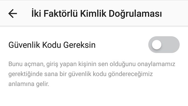 Sosyal medya hesapları hackerların başlıca hedefleri arasında yer alıyor. Durum böyle olunca şifrenizi olabildiğince zor bir kombinasyon haline getirmek yeterli olmuyor. Bu gibi problemlerden kaçınmak için iki faktörlü kimlik doğrulamasına geçiş yapmak yararlı olabilir. Bunun için yine kendi profilinizi açıp, ekranın üstündeki üç nokta simgesine basıyordunuz. Ardından “iki faktörülü kimlik doğrulaması” kısmına gelip “güvenlik kodu gereksiz” özelliğini aktif hale getiriyorsunuz. Bu noktadan sonra hesabınıza biri giriş yapmak istediğinde önce telefonunuza gönderilen bir güvenlik kodunu girmesi gerekiyor.