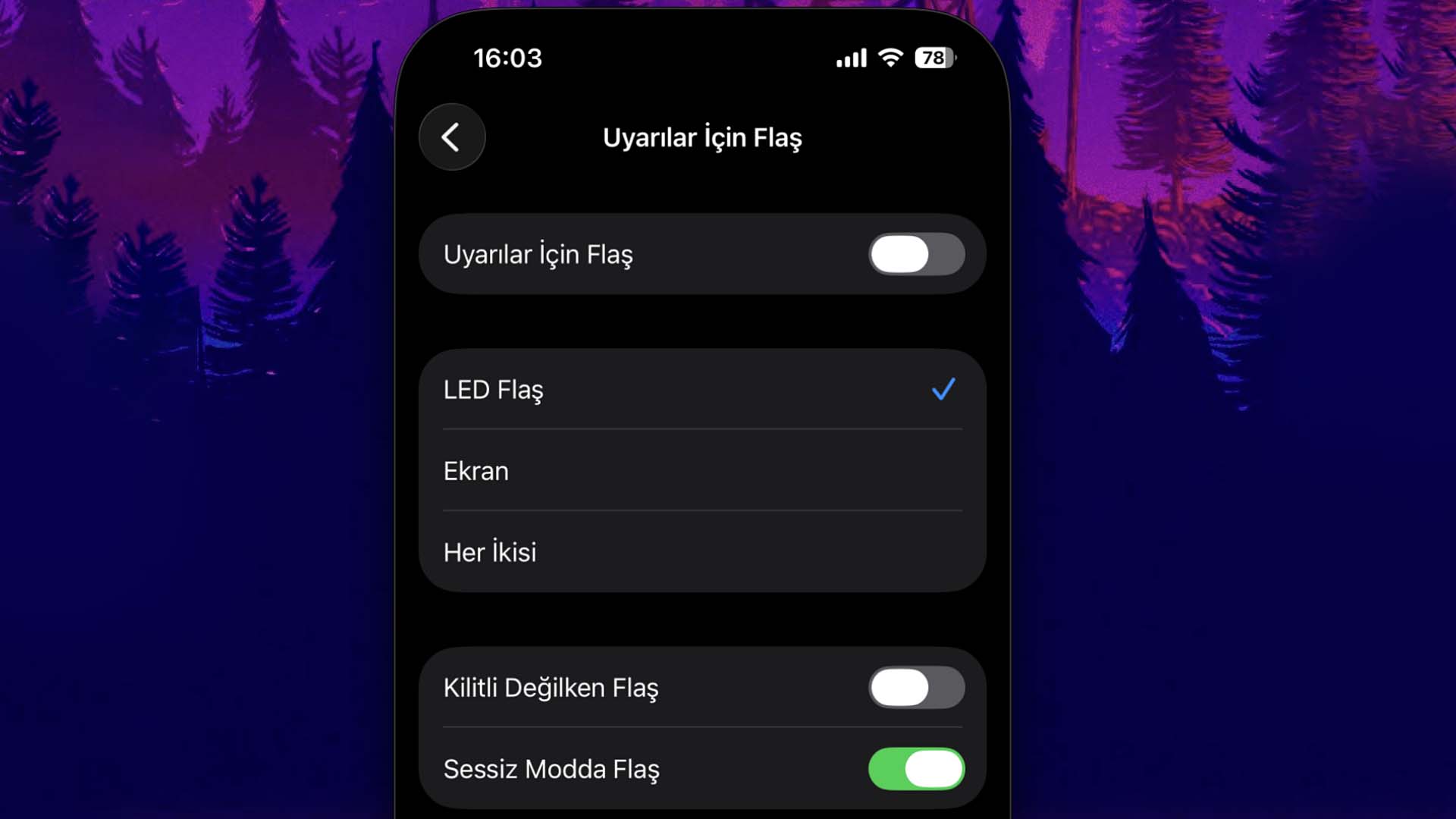 -Erişilebilirlik Ayarları’ndaki Uyarılar İçin Flaş seçeneği, bir bildirim aldığınızda aygıt ekranının yanıp sönmesini sağlayan ek bir seçenek sunar.