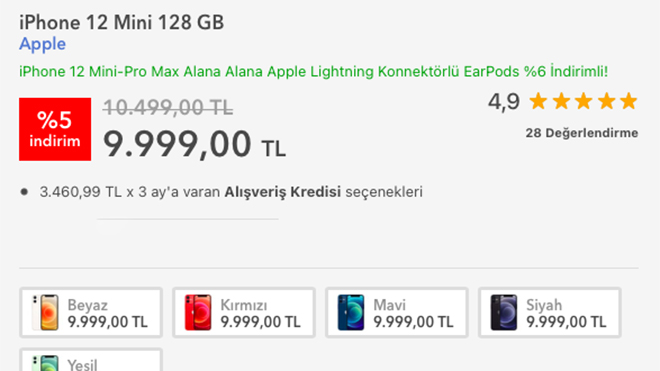 iPhone 12 modeliyle birlikte iPhone 12 mini modelinin de fiyatı geriledi. Piyasadaki satış fiyatı 10.499 TL olan telefonun fiyatı 9.999 TL‘ye düştü. 128 GB’lık telefonun tüm renk seçenekleri için bu fiyat geçerli.