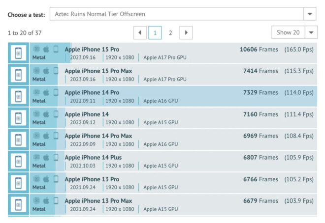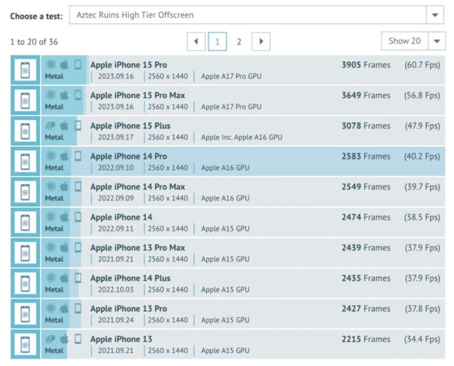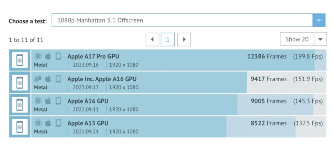 iPhone 15 Pro ve 15 Pro Max modellerinin kalbindeki A17 Pro için geçtiğimiz günlerde ilk olarak bir Geekbench sonucu çıkmıştı. İşlemci yapılan testte tek çekirdekten 2914, çok çekirdekten ise 7199 puan almıştı. Karşılaştırmak adına aynı testten iPhone 14 Pro ve 14 Pro Max’teki A16 Bionic işlemci 2519 ve 6367 puanlar alıyor. Daha önceki A15 Bionic’in sonuçları ise 2183 ve 5144 seviyesinde yer alıyor. A17 Pro’nun test sonucu Apple’ın iddia ettiği performans artışını karşılıyor, TSMC’nin 3 nm üretim sürecinden çıkarılan işlemci spesifik olarak GPU yani grafik tarafında hatırı sayılır bir artış getiriyor. Bugün işte tam olarak bunu gösteren bazı sonuçlar geldi. A17 Pro’daki GPU, genel olarak A16 Bionic’teki GPU’ya oranla yüzde 20’ye kadar daha yüksek performans sunuyor, GFXBench merkezli bir testte 14 Pro modeli 40 fps alırken, 15 Pro ile 60 fps alınabiliyor. Başka bir testte ise tam 50 fps kadar fark karşımıza çıkıyor. Bu gerçekten hatırı sayılır bir seviye ve yeni telefonlarda oyun konusundaki “konsol seviyesi” iddiasını gerçeğe dönüştürecek gibi görünüyor. A17 Pro ile elde edilen tüm sonuçları aşağıda görebilirsiniz: