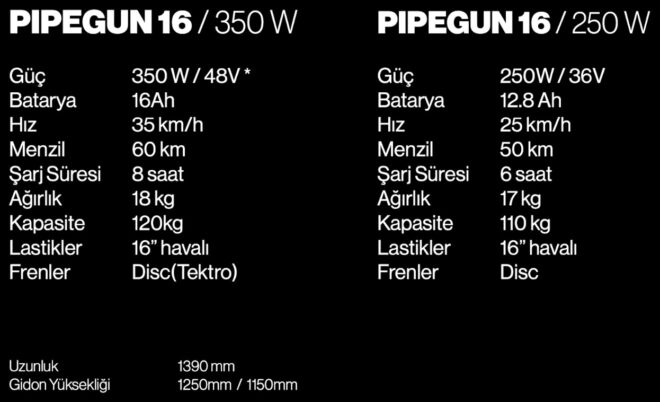 En son tüm detaylarına burada yer verdiğimiz Joyce’90 modeliyle gündemimize gelen TOZZBIKE, bu sefer Pipegun Sixteen ile ses getiriyor. Yeni “kick-bike” modeli 350W ve 250W olmak üzere iki farklı versiyona sahip. 350W/48V gücündeki üst modelde 16 Ah batarya bulunuyor. 35 km/s hız ve 60 km menzil açıklanan model, 18 kg ağırlığında ve 8 saatte tamamen şarj edilebiliyor. 250W/36V gücündeki alt modelde ise 12,8 Ah batarya bulunuyor. 25 km/s hız ve 50 km menzil açıklanan model, 17 kg ağırlığında ve 6 saatte tamamen şarj edilebiliyor. 120 ve 110 kg’a kadar taşıma kapasitesi bulunan modeller, 16 inç havalı lastikler üzerinde yol alıyor. BMX gidon sayesinde sürüş yapmanın standart elektrikli scooter’lardan daha konforlu olduğu Pipegun Sixteen için sunulan renkler, şirket tarafından çeşitli dönemlerin yankılarını yansıtacak şekilde adlandırılıyor: “Surfer White, Shadow Black, Miami White, 90’s Black, Baker Green, Beachfire Red ve Cool Silver. “