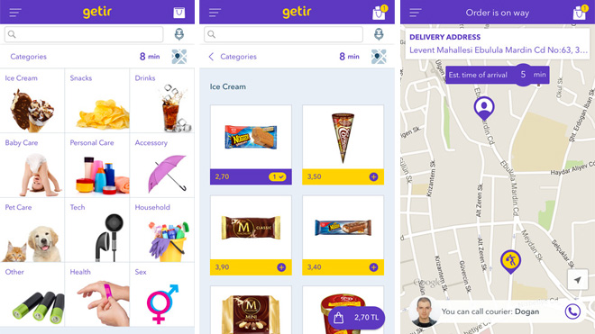7 gün 24 saat boyunca hizmet veren uygulamada ilk olarak adres belirleniyor ve kart bilgileri tanımlanıyor. Sonrasında 300 çeşit ürün arasından istenenler belirleniyor ve Getir’in geniş kurye ağı sayesinde ortalama 10 dakika gibi kısa bir sürede müşteriye ulaştırılıyor. Sipariş sonrası canlı olarak kuryenin nerede olduğu da görülebiliyor. Ürünler arasında bebek bezi, köpek maması, deterjan gibi her zaman gerekli olabilecek ürünlerin yanı sıra çikolata, kuruyemiş veya oyun gibi ürünler de mevcut. Şu anda İstanbul’un büyük bir bölümünde hizmet veren Getir’in önümüzdeki dönemlerde İstanbul’un tamamında kullanılabileceği belirtiliyor. iOS ve Android işletim sistemiyle uyumlu Getir uygulamasını yüklemek için haberin devamında yer alan linkleri kullanabilirsiniz.