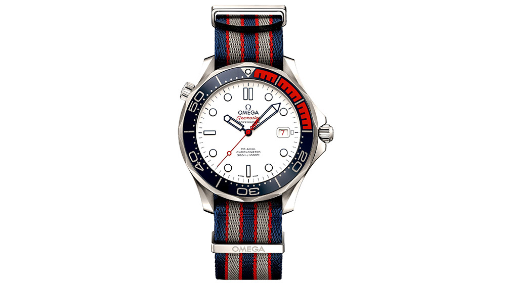Tasarımıyla İngiliz Kraliyet Donanmasının renklerinden ilham alan saat, beyaz, mavi ve kırmızı renklerdeki detaylarıyla hoş bir görünüm sunuyor. 41 mm paslanmaz çelik kasaya sahip olan saat, mavi seramik Liquidmetal dalış zamanı skalasını ve kırmızı kauçuktan oluşan, dalışın ilk 15 dakikasını kapsayan bir bezeli bünyesinde barındırıyor. Orta saniyede yer alan 007 logosu ve diğer tüm rakamlar maviyken; tarih penceresinden görünen kırmızı renkteki 7 rakamıyla dikkat çeken saatin parlatılmış beyaz seramik kadranında 12 adet mavi saat göstergesi bulunuyor. Saatte bununa birlikte kırmızıyla yazılmış “Seamaster” kelimesi ve mavi iskelet akrep-yelkovan da yer alıyor. Mavi, kırmızı ve gri renklerdeki NATO bileziğini, 5 şeritli deseni ve parlak tokası tamamlıyor. Dalga kenarlı kasa arkasında, Komutanın denizci ambleminin “üç şeridi”, rotor üzerinde 007 “kurşun” tasarımıyla öne çıkıyor.