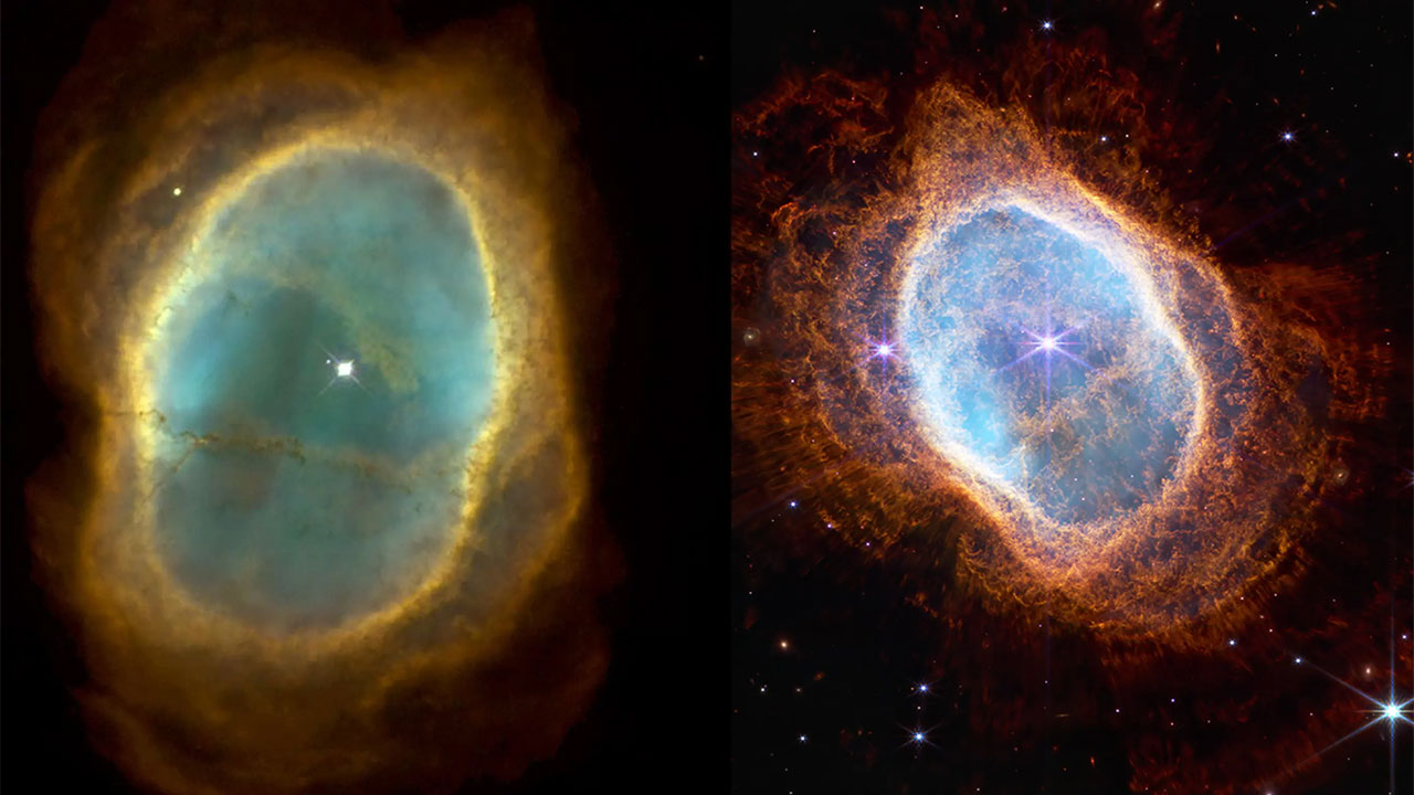 Southern Ring Nebulası (Solda Hubble, sağda James Webb)⇓