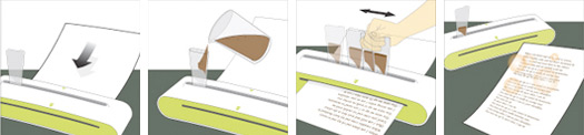 RTI Coffee Printer kahve telvesini mürekkep olarak kullanabilen konsept bir ürün. Bu ay LOG Dergisi kapak konusunda da yerini alan Greener Gadgets Design Competition tasarım yarışması katılımcılarından Jeon Hwan Ju’s imzalı ürün, yarışmanın favorileri arasında. Ürün kahve telvesinin yanı sıra aynı zamanda kullanılmış çay da kullanabiliyor. Ürünün diğer bir kritik özelliği ise elektrik kullanmaması. RITI Coffee Printer‘ı kullanabilmek için aşağıdaki örnek çizimde olduğu gibi kullanıcının kartuşu sağa sola doğru hareket ettirerek yazıcıyı çalıştırması ve baskı yapması gerekiyor. Ürün hayat bulur mu bilinmez ama fikrin harika olduğu bir gerçek.
