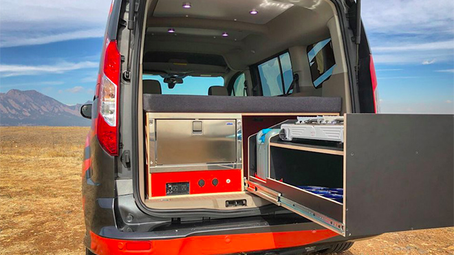 Denver merkezli Contravans isimli şirket, Ford Transit Connect’i bir karavana dönüştürdü. 5 kişilik oturma kapasitesine sahip olan Ford Transit Connect Camper bir aile için yeterli bir oturma kapasitesi sunuyor. Ford Transit Connect araç karavana dönüşmek için üçüncü oturma sırasının kaldırıldığı belirtiliyor. Ford Transit Connect karavan minibüsünün arkasında, çekmece tarzı bir buzdolabı ve altında depolamalı iki gözlü bir ocak bulunuyor. Dışarıya çekilebilen depolama bölümünün su depolamak için bir yeri de mevcut. Akü ve elektrikli eşyalar için bir bölme de arkada karşımıza çıkıyor. Uyku zamanında ikinci sıra koltuklar katlanıyor ve uzatılmış bir yatak platformu katlanmış koltukların üstünden dışarı çıkıyor. Üstte yer alan yatak, iki kişinin karavanın içinde uyumasına imkan tanıyor.