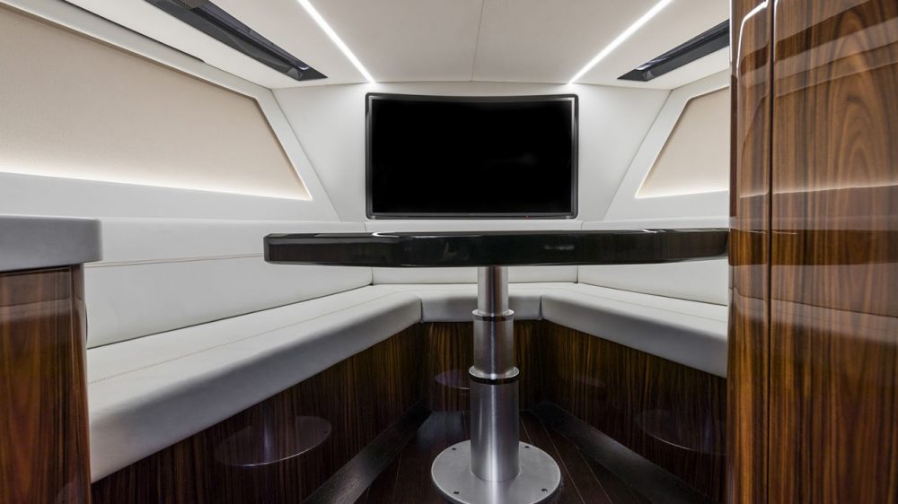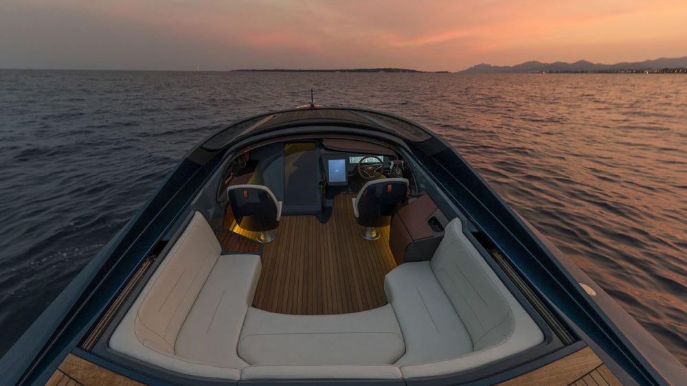 Quintessence Yachts ile birlikte üretilen AM37 Powerboat’tun gövdesi bölüm bölüm farklılık gösteren komponentlerden oluşuyor. AM37, otomobil ve deniz üretim bandı izlerinin tek bir noktada kesiştiği bir ürün olarak dikkat çekiyor. Yatın kokpit tasarımında tıpkı bir otomobil havası mevcut. Direksiyon simidi ve ön tarafta konumlandırılan büyük ekran kokpite geçtiğinizde ilk dikkat çeken öğeler arasında yer alıyor. Bu ekran üzerinden yat üzerinde sunulan bütün özelliklere uzaktan erişim sağlamak mümkün. AM37 kullanıcı güvenliğini sağlamak adına dahili parmak izi tanıma sistemine de sahip. Yat bünyesinde yer alan su altı ışıklandırma sistemi ve koktely barı ise opsiyonel olarak sunuluyor