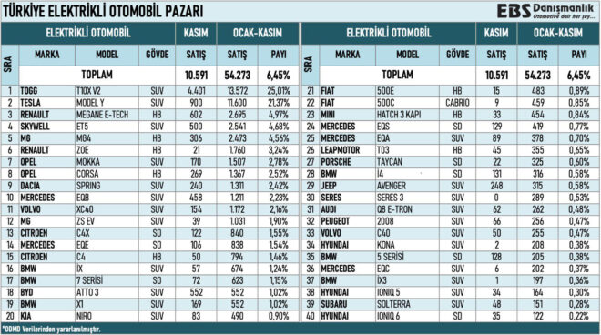Otomotiv Distribütörleri ve Mobilite Derneği verileri üzerinden kasım ayında Türkiye’de en çok satılan sıfır elektrikli otomobil modelleri listelendi.