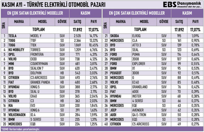 Otomobil gazetecisi Emre Özpeynirci tarafından burada yapılan paylaşıma göre kasım ayında Türkiye’de en çok satılan sıfır elektrikli otomobil modeli, 2.535 adetlik satışla Tesla Model Y oldu. İkinci sırada karşımıza 2.366 adetlik satış gerçekleştirilen Togg T10F çıkıyor, üçüncü sırada ise 1.869 adetlik satışla Togg T10X bulunuyor. Dördüncü model ise 1.209 adetlik satışa ulaşan KG Mobility Torres olmuş durumda. Kasım ayının satış konusunda ilk 10 modeli tam olarak şöyle sıralanıyor: