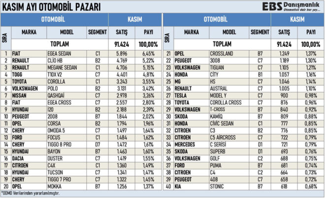 Emre Özpeynirci tarafından burada yapılan paylaşıma göre kasım ayında Türkiye’de en çok satılan sıfır otomobil modeli Fiat Egea Sedan oldu. İkinci sırada karşımıza geçtiğimiz ayın lideri Renault Clio HB çıkıyor, üçüncü sırada ise Renault Megane Sedan bulunuyor. Listenin devamında ise sırasıyla Togg T10X, Toyota Corolla, Volkswagen Polo, Nissan Qashqai, Fiat Egea Cross, Hyundai i20, Peugeot 2008, Opel Corsa, Chery OMODA 5, Ford Focus, Chery TIGGO 8 Pro, Hyundai Bayon, Dacia Duster, Citroen C4X, Hyundai Tuscon, Chery TIGGO 7 Pro ve Opel Mokka gibi modeller sıralanıyor. Verilere baktığımız zaman lider Fiat Egea Sedan’dan kasım ayında toplam 5.896 adet satıldığı görülüyor. Renault Clio HB modelinden ise kasım ayında toplam 4.769 adet satılmış. Türkiye’deki pazarın 10 ay sonrasındaki genel liderlik koltuğunda ise halen 74 binden fazla satış ile Fiat Egea Sedan oturuyor: