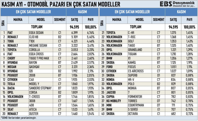 Otomotiv Distribütörleri ve Mobilite Derneği verileri üzerinden kasım ayında Türkiye’de en çok satılan sıfır otomobil modelleri listelendi.