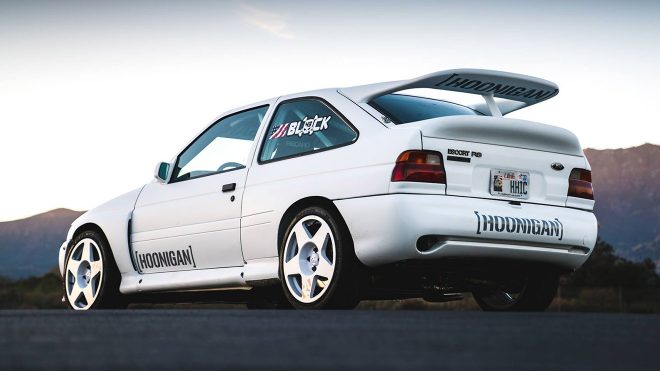 Yakın zamanda Pikes Peak‘te gerçekleştirdiği gösterisiyle karşımıza çıkan Ken Block gerçekleştirdiği yeni projelerle dikkatimizi çekmeye devam ediyor. Geçtiğimiz hafta içerisinde Hoonigan Racig ile birlikte katılım gerçekleştirdiği FIA World Rallycross Championship organizasyonundan çekildiğini açıklayan Block, gösterilerinde kullanılmak üzere yeni oyuncağını resmi kaynakları üzerinden takipçileriyle paylaştı. Ford Performance sponsorluğunda Fiesta, Focus ve Mustang gibi özel modellerle bizleri selamlayan Block ve ekibinin son adresiyse Focus öncesi asfaltı terleten Escort oldu. Tabii ki söz konusu Ken Block olduğunda standartlarda bir Escort beklemek çok da doğru bir yaklaşım olmaz. Üstelik bu arada üzerinde RS imzasını taşıyorsa!