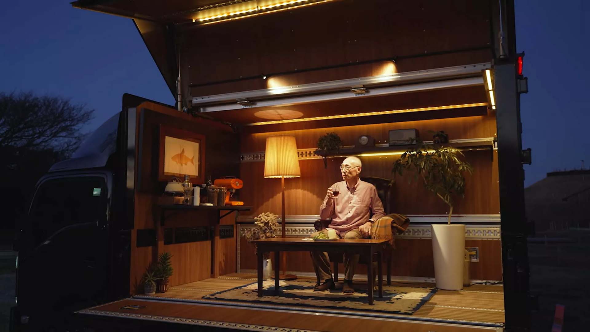 Tokyo Auto Salon 2026 kapsamında sergilenmek üzere tek bir örnek olarak hazırlanan Isuzu Elf MUV (Multi Utility Vehicle) modeli, Nippon Fruehauf iş birliğiyle hayat bulmuş. Standart Isuzu Elf’in temel alındığı araç, siyah gövde rengi, altın renkteki çizgileri ve aerodinamik performansı artırmaya yönelik parçalarla dikkat çekici görünüyor. Modelin esas fark yarattığı nokta ise elbette içindeki retro temalı oturma odası oluyor. Açılabilir yapıdaki arka bölümde kapitone detaylı bordo renkte deri bir koltuk (Chesterfield tarzı) ve önünde sade, ahşap bir orta sehpa bulunuyor. Sol tarafta şık bir lambadere yer verilirken, ahşap döşemelerin tercih edildiği Elf MUV’da farklı bitkiler de yer alıyor. Duvarlarda da ahşap paneller kullanarak metalik kamyon kasasına sıcak bir oda havası katan şirket, Elf MUV’a açılabilir yapıdaki rafa kahve makinesi gibi gidilen yerin tadını tam olarak çıkarmaya yönelik eklemeler gerçekleştirmiş.