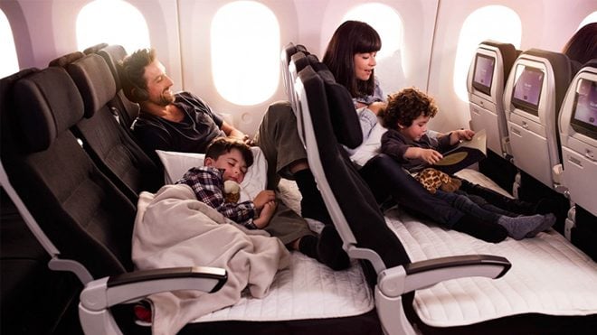 Yolculuk süresi uçak seyahatlerinde kısa olsa da özellikle de çocuklar, fizyolojik olarak zor zamanlar geçirebiliyor. Üstüne bir de sıkışarak seyahat eden ebeveynler, bu tür durumlar yaşandığında en az çocukları kadar rahatsız oluyor. Yeni Zelanda Hava Yollarının sunduğu konforlu koltuklarla yolcular en azından çocuklarını daha rahat idare edebiliyor. 1,55 metre uzunluğa sahip koltuklar “Skycouch” ismini taşıyor. Koltuklarda çocuk güvenliği için emniyet kemerleri de bulunuyor. 2018’in ortasında geçilen bu sistem, sadece çocuklu yolculara özel değil. Kendini evinde gibi hissetmek isteyenler de bu koltukların sunduğu konfordan faydalanabiliyor. Ekonomi uçuşlarına da dahil olan koltuk eklentileri için özel bir fiyatlandırma bulunuyor. Öncelikle üç koltuk için de uçak bileti satın almanız gerekiyor. Ardından Skycouch’tan faydalanacak kişi sayısına göre; uçuş tarifesi de göz önüne alınarak Skycouch fiyatı veriliyor.