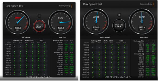 M2 işlemcili 13 inç MacBook Pro ile beraber tanıtılan M2 işlemcili MacBook Air, SSD konusunda üzücü bir detaya sahipti. Yapılan ilk incelemeler sonrasında ortaya çıktığı üzere aynı M2 işlemcili 13 inç MacBook Pro modelinde de olduğu gibi M2 işlemcili MacBook Air’in 256 GB’lık SSD depolama birimi de yerini aldığı M1 işlemcili MacBook Air’in 256 GB’lık SSD depolama biriminden daha yavaş çalışıyordu. Blackmagic Disk Speed Test uygulamasında yapılan 5 GB’lık aktarım testi kapsamında dizüstünün 512 GB SSD’li versiyonu 2.187 MB/s yazma ve 2.824 MB/s okuma hızlarına ulaşıyor. 256 GB SSD’li sürüm ise 1.573 MB/s okuma ve 1.536 MB/s yazma değerleri veriyor. İşte bu durum yeni tanıtılan ve satışa sunulan M2 işlemcili Mac mini ve MacBook Pro modellerinde de kendisini gösteriyor. Yapılan incelemelere göre M2 temelli yeni 256 GB Mac mini ve M2 temelli yeni 512 GB MacBook Pro, yerlerini aldıkları M1 işlemcili versiyonlara oranla daha düşük yazma ve okuma hızları sunuyor.