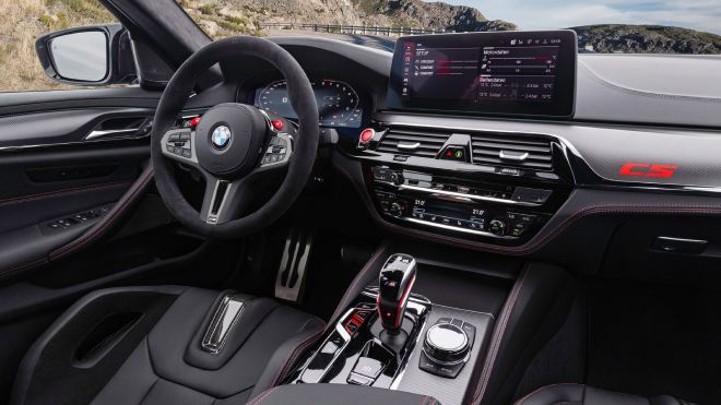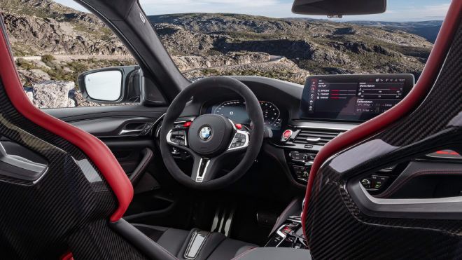 Yeni BMW M5 CS’deki sürüş deneyiminin keyfini M Carbon koltuklarda oturan sürücü ve yolcular en üst seviyede yaşarken, siyah Merino deri kaplamalar Mugello Kırmızısı dekoratif dikişlere sahip. Ön koltuklar için aydınlatmalı M5 logoları içeren entegre koltuk başlıkları, efsanevi Nürburgring pistinin silüetini yansıtıyor. M Alcantara direksiyon simidinin üzerinde bulunan vites değiştirme kanatçıkları karbon fiberden üretilirken, direksiyon simidinin kollarında kullanılan siyah krom kaplamalar ise Yeni BMW M5 CS’in sıra dışı performansına vurgu yapıyor.