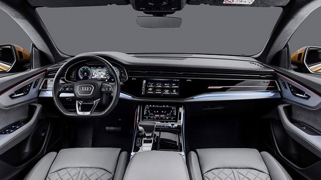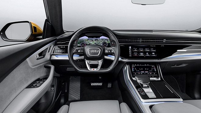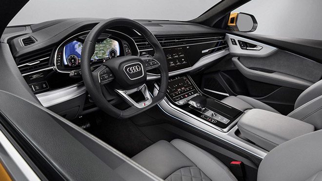 Tasarım kısmıyla sekizgen formlu ön panel, büyük hava girişleri ve L formlu LED ışıklarıyla güçlü bir karakter ortaya koyan araçta, 22 inç‘lik jant setinin ve HD Matrix LED farların (opsiyonel) yer aldığını da tanıtımla birlikte öğreniyoruz. İç tasarımda yer alan üç farklı ekranın ebatları ise 12,3 inç sürücü, 10,1 inç multimedya ve 8,6 inç kumanda olarak dağılım gösteriyor. Teknolojik asistan kısmında beklediğimiz gibi eli bir hayli zengin olan Audi Q8’de; uzaktan park pilotu (2019’da sunulacak), şerit takip ve müdahalesi, akıllı adaptif hız sabitleyici, yokuş iniş desteği ve 360 derecelik görüş sağlayan kamera gibi hayati fonksiyonlar ön planda.