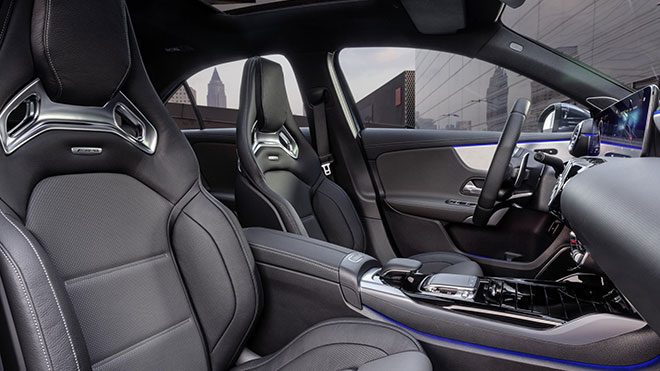 İç mekan ise AMG’nin yeni tip altı düz ve kırmızı dikişli direksiyon simidine ve arkasındaki vites kulakçıklarına sahip. Bunun dışında yeni MBUX bilgi ve eğlence sistemi ile tamamen dijital gösterge paneli, diğer A-Sınıfı modellerinden olduğu gibi aktarılıyor. Kaygan, Konfor, Sport, Sport+ ve Kişiselleştirilebilir olmak üzere dört farklı sürüş modu sürücülerin kullanımına sunuluyor.