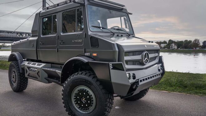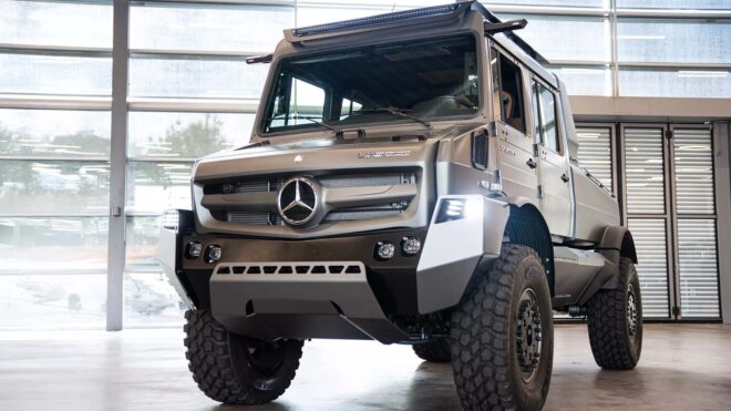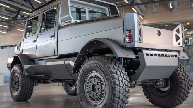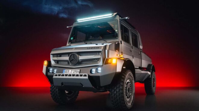 Mercedes-Benz’in ürün gamındaki en özel araçlardan olan “Unimog”, tam 80 yıldır aramızda bulunuyor. Bunu kutlamak adına “Hellgeth Engineering” ile bir araya gelen Mercedes-Benz, oldukça modern görünüşe sahip özel bir Unimog hazırladı. Bir şov aracı olarak hayat bulan modelin temelinde U 4023 yer alıyor ancak farklı bir motora yer veriliyor. Özel araçta 228 beygir güç üreten 5,1 litrelik dört silindirli motorun yerini; 297 beygir güç üreten 7,7 litrelik altı silindirli dizel ünite (OM 936) alıyor. Ayna yerine kameraların kullanıldığı modelin üst kısmında geniş bir LED ışık barı yer alıyor. Mat rengin ve 20 inç beadlock jantların tercih edildiği araç, her koşulda yol alabilecek bir canavar olarak gerçekten harika görünüyor.