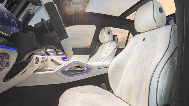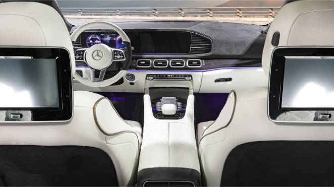 Kapıyı açtığımızda ise, neredeyse her dokunulabilir her yüzeyin yeniden döşendiğini görüyoruz. Burada bolca Nappa deri ve Alcantara kullanıyor. Şirketin logosu koltuk sırtlıklarına ve arka koltuk başlık yastıklarına gömülü. Proje kapsamında arka bölümü orta konsolla bölünen GLE’de sadece dört kişi oturabilecek. Hofele’nin diğer projelerine buradan ulaşabilirsiniz.