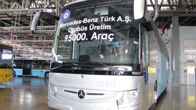 Türkiye’nin yabancı sermayeli en büyük şirketlerinden biri olan Mercedes-Benz Türk, üretime başladığı 1968 yılından bu yana toplam 95.000 adet otobüs üretti. 95.000’inci otobüs olan yeni Tourismo, dünyanın en modern ve entegre otobüs fabrikalarından biri olarak kabul edilen Hoşdere Otobüs Fabrikası’ndaki üretim ve kalite kontrol süreçlerini tamamlayarak İspanya’ya doğru yola çıkıyor. Hoşdere Otobüs Fabrikası’nda üretilmiş olan otobüsün öne çıkan özellikleri arasında engelli yolcular için bulundurulan lift ve 394 beygir gücündeki Euro VI motorunun yanı sıra en ileri güvenlik sistemleri olan araç mesafe takip, acil fren ve şerit takip sistemleri yer alıyor.