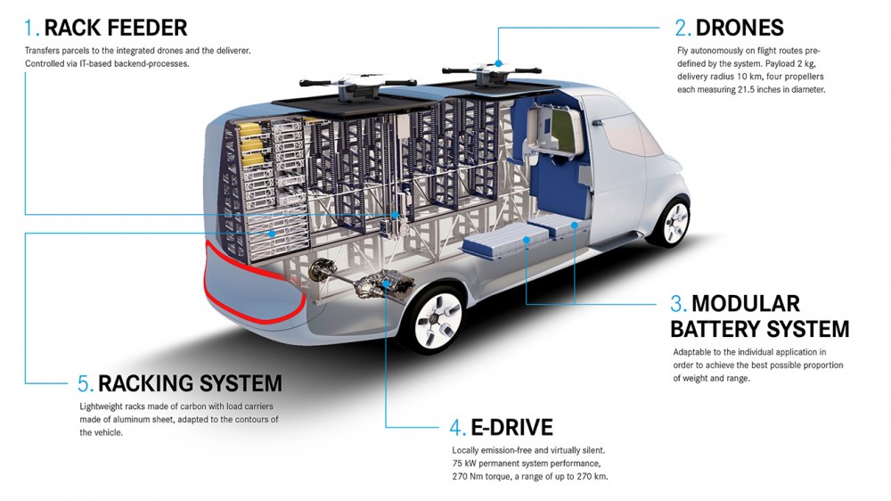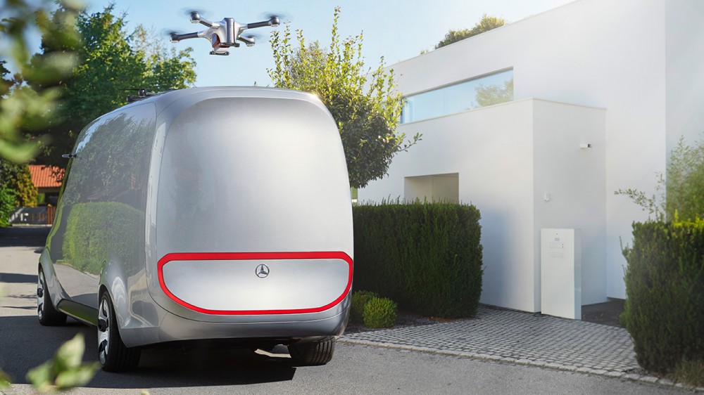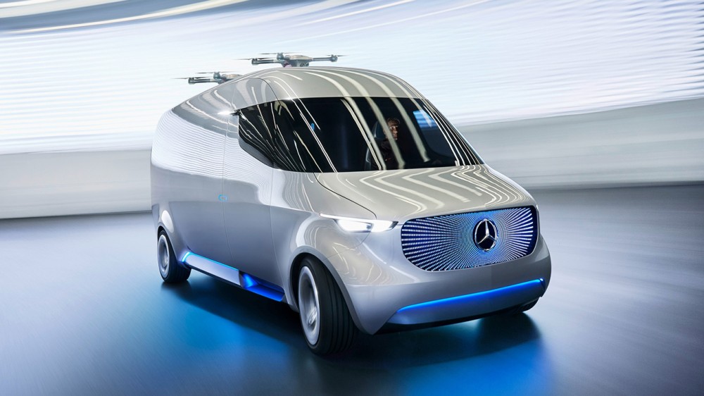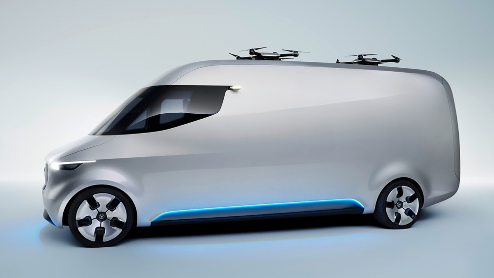 Kurye drone’ları ile öne çıkan Matternet firması ile geleceğin ulaşım araçlarına ciddi bir şekilde yatırım yapan Mercedes, kısa mesafe kurye ve taşımacılık hizmetlerine yeni bir boyut kazandıracak olan modeli Vision Van’ı ortaya çıkardı. Vision One tasarım hatları ve teknik özellikleri ile gerçekten dikkat çekiyor. Üst tarafında 2 adet drone bulunan Vision Van, trafik yoğunluklarında veya aracın giremeyeceği yerlerde, iletilmesi gereken paketin daha hızlı ve kolay olarak ulaştırılmasını sağlıyor. Kontrol ünitesi de standart bir ulaşım aracın oldukça farklı. İç tasarımında direksiyona yer verilmeyen Visin Van’da kontroller joystick ile sağlanıyor. Vision konsept 100 beygirlik ve 270 Nm‘lik güce sahip elektrikli motor ile beraber 270 km menzile sahip. Bu mesafe gün içerisinde kullanıcısını tatmin edecek düzeyde.