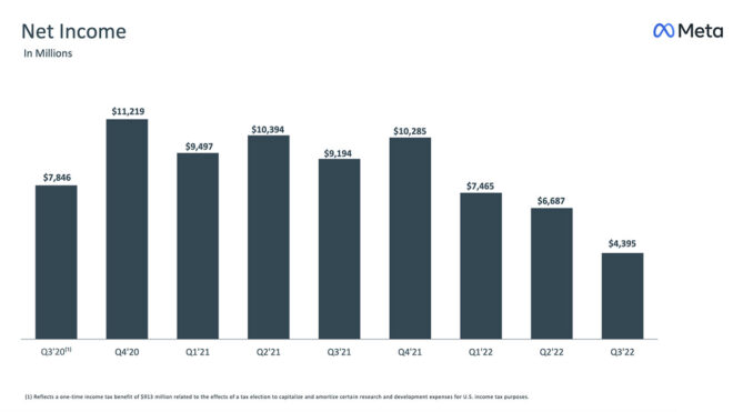 Meta, 2022’nin üçüncü çeyreğinde 27,7 milyar dolar gelir ve 4,3 milyar dolar net kâr açıkladı. Sadece üç aylık bir dönemde milyar dolarlık net kâr elbette az değil ancak firma bu yıl her çeyrek daha az net kâr açıklıyor. Bunu hemen aşağıda görebileceğiniz tablo açıkça ortaya koyuyor. Örneğin firma 2021’in üçüncü çeyreğinde yani aynı döneminde 9,1 milyar dolar net kâr açıklamıştı. Gelirlerin düşmesine neden olarak küresel ekonomik durumları ve enflasyonu gösteren Meta, gelir kaybını yatırımcılarına metaverse tarafına yapılan büyük yatırımlar üzerinden olumlu göstermeye çalışıyor.