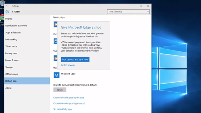 Kullanıcılar varsayılan internet tarayıcısını değiştirmek istediğinde bir uyarı penceresiyle karşılaşıyor. Bu pencerede Microsoft Edge‘in özelliklerinden bahsediliyor ve kullanıcının geçiş yapmak konusunda emin olup olmadığı bir kez daha soruluyor. Pencerede Microsoft Edge’e bir şans verilmesi için yer alan butonun daha büyük ve renkli şekilde tasarlandığı, varsayılan taracıyı değiştirmek için bulunan butonun ise daha küçük ve dikkat çekmeyecek şekilde olduğu görülüyor. Benzer bir durum varsayılan fotoğraf, video ve müzik uygulaması değiştirilmek istendiğinde de yaşanıyor. Bu onay pencerelerinin önümüzdeki hafta yayınlanacak güncelleme ile birlikte geleceği ifade ediliyor.