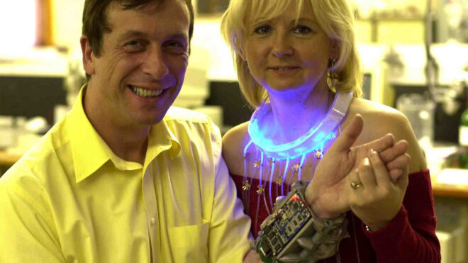 Warwick’in sinir sistemine bağlı olan kolyeyi Warwick’in eşi takıyor. Kolye, kablolar aracığıyla Kevin Warwick’in sinir sisteminden aldığı sinyallere göre renk değiştiriyor.