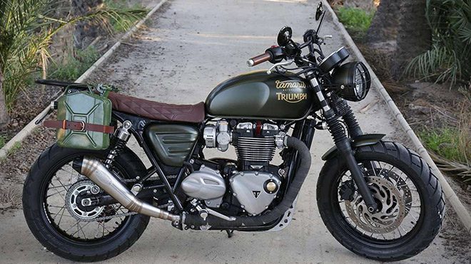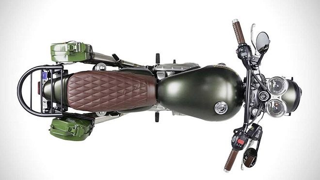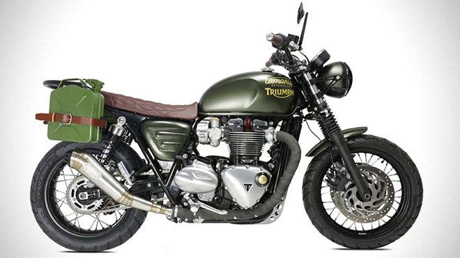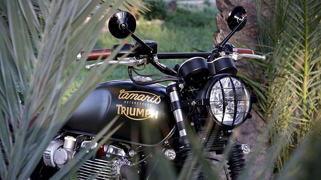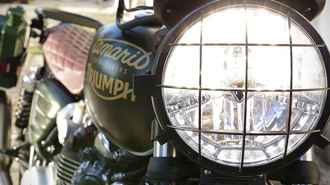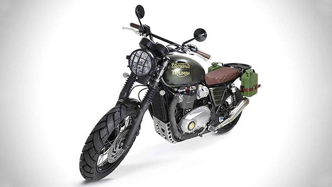 Tamarit ekibinin “en özel projelerimizden birisi” olarak nitelendirdiği Muralla beraberinde hatırı sayılı değişimler getiriyor. Lastiklerden başlayan bu değişim; çatal, ışıklandırma, gidon, sele, egzoz ve depo tasarımıyla tamamlanıyor. Standart versiyonda belirli bir çizgi şeklinde seyreden egzozu yukarı kaldırarak muhtemel arazi sürüşleri için önlem alan ekip, bu tarz motorların olmazsa olmazları arasında yer alan amyant eklemesini de yapmayı ihmal etmiyor. Arka bölümün her iki tarafına 5’er litrelik yedek benzin bidonları yer alırken, bu tasarım tercih edilen kamuflaj yeşiliyle keyifli bir uyum sergiliyor. 1200cc‘lik makinesiyle 80 beygir güç ve 100 Nm tork değerleri üreten ve 6 ileri şanzımanla kombin edilen 2016 Triumph Bonneville T120, Muralla projesiyle birlikte sokaklarda görmekten keyif alacağımız bir ruha sahip.