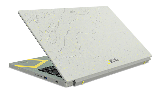 Yeni Aspire Vero’nun gövdesinde yüzde 30 oranında geri dönüştürülmüş plastik malzemesi yer alıyor. Bilgisayarda kullanılan sarı pigment noktaları, dokulu gri yüzeyiyle kontrast oluşturuyor. Bilgisayarın üst kapağın yarısı boyunca uzanan ve topografik bir haritadan alıntı izlenimi veren çizgiler, cihazın yüzeyini kara ve deniz olarak ikiye ayırıyor. Bilgisayardaki klavyenin sağ alt köşesinde National Geographic’in ikonik sarı çerçevesi yer alıyor.