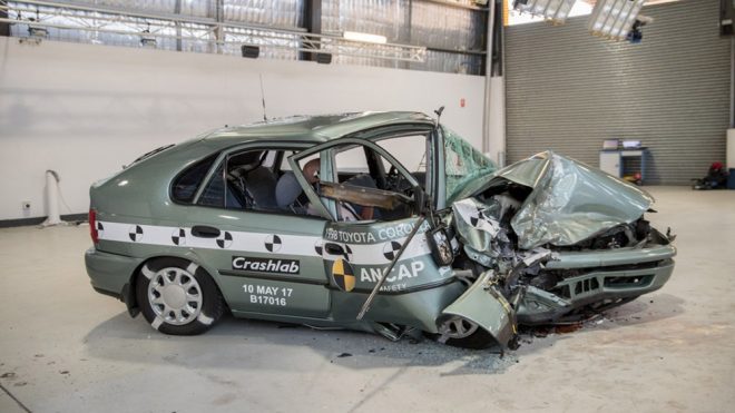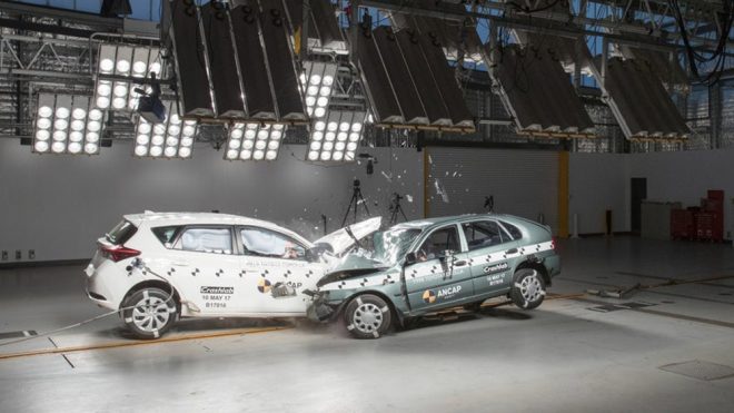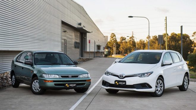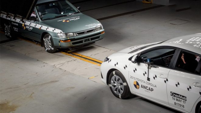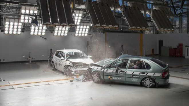 Avustralya NCAP tarafından gerçekleştirilen testte dünyanın en çok satan otomobillerinden birisi olan Toyota Corolla‘yı başrolde görüyoruz. 1998 yılında üretilen versiyon ile 2015 yılındaki versiyonu karşı karşıya getiren çarpışma testinde araçların sahip olduğu karoser ve donanımların nereden nereye geldiğini çok net bir yapıda görmek mümkün. Saate 64 kilometrelik hız sınırıyla gerçekleştirilen testin ardından 1998 model Corolla’da yer alan mankenin baş, boyun ve ayak bölgesinde ciddi seviyede yaralanma riski gözlemlenirken 2000 yılı öncesinde üretilen araçlarda ölümlü kaza oranın yüzde 33 oranında olduğunun altı çiziliyor.