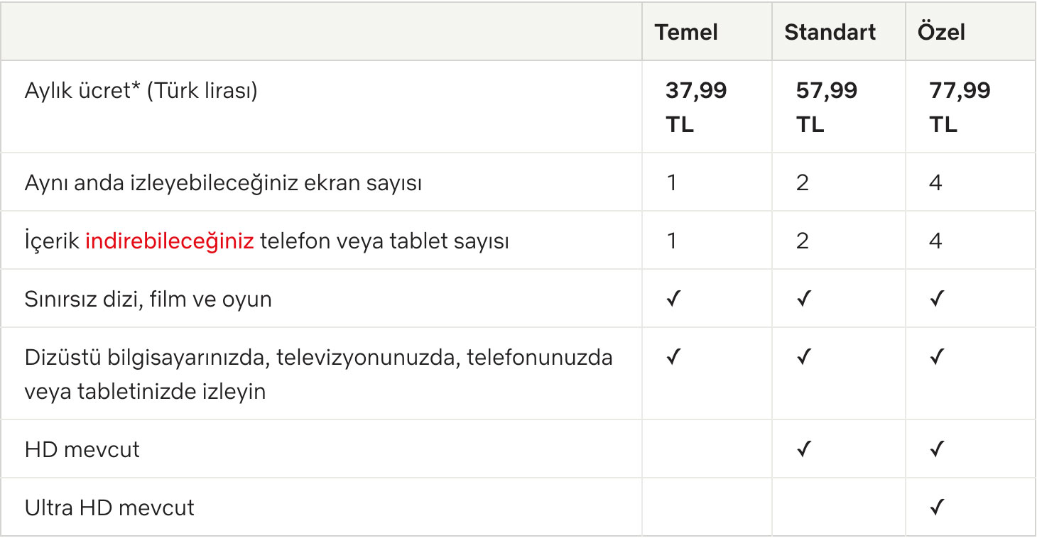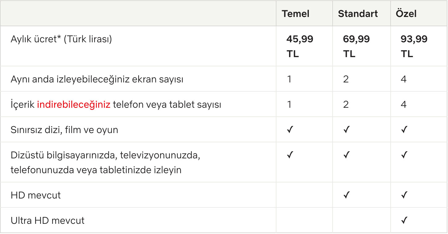 Netflix Türkiye yılın başında Temel paket için 26,99 TL, Standart paket için 40,99 TL, Özel paket içinse 54,99 TL alıyordu. Daha sonra bu fiyatlara artışa gidildi. Bugüne kadar Temel paket 37,99 TL, Standart paket 57,99 TL, Özel paket ise tam 77,99 TL olarak satılıyordu. 13 Eylül itibarıyla ise fiyatlarda ciddi bir artış daha oldu. Artık Temel paket 45,99 TL, Standart paket 69,99 TL, Özel paket ise tam 93,99 TL oldu.