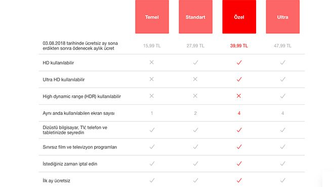 Pek tabii HDR destekli videoların izlenebilmesi için HDR uyumlu bir televizyon sahibi olmanız gerekiyor. Aylık 47,99 TL ücret ödeyen kullanıcılar Ultra paketinden yararlanabiliyor. Bu fiyatı yüksek bulan kullanıcılar 4K videolara destek veren özel paketi tercih edebilirler. Kullanıcıların bu paket için 39,99 TL ücret ödemesi gerekiyor. HD videoların yer aldığı standart paketin aylık ücreti 27,99 TL, temel paketin aylık ücreti ise 15,99 TL. Bu pakette HD video desteğinin yer almadığını söyleyelim.