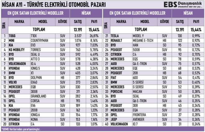 Otomotiv Distribütörleri ve Mobilite Derneği verileri üzerinden nisan ayında Türkiye’de en çok satılan sıfır elektrikli otomobiller listelendi.