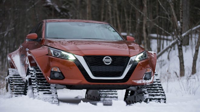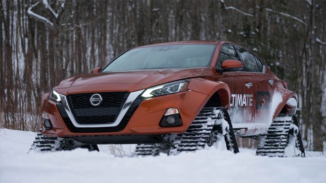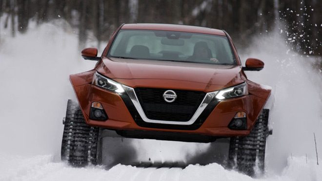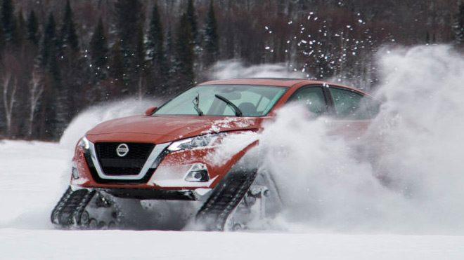 Yapılan en garip Nissan aracı denildiğinde akıllara hala 350Zki geliyor. Model arkadan itişli olduğu için sadece arka bölüme ray sistemi takılmış. Ön tekerlekler yerine ise kayak takımları monte edilmiş. Aracın üstü açılabilir versiyonunu seçmeleri ise durumu daha da çılgınca yapıyor. Karda neden üzeri açık bir arada ile gezmek isteyesiniz ki? En azından Altima daha sıcak tutar…