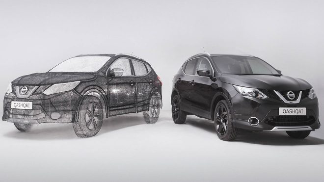 Nissan Qashqai, Crossover liginin Avrupa’da ki en popüler temsilcilerinden bir tanesi. Nissan fabrikasından her saat başı 58 araba çıkarken marka satışlarını arttırmak ve liderliğini pekiştirmek adına yeni stratejiler geliştirmeye devam ediyor. Qashqai’nin özel üretim versiyonu olan yeni Black Edition’un standart boyutları olan 4,4 metre uzunluk ve 1,6 metre yükselik değerlerine sadık kalınarak yapılan ve tamamen el işçiliği ile oluşturulan heykel üç boyutlu kalem ile 800 saatte yapıldı. Yapım aşamasında ise genişliği 0,7 mm olan tam tamına 13,8 km filament kullanıldı. 3.360 adet olarak sınırlı sayıda üretilecek olan Nissan Qashqai Black Edition markanın çok önem verdiği bir model olarak öne çıkıyor.