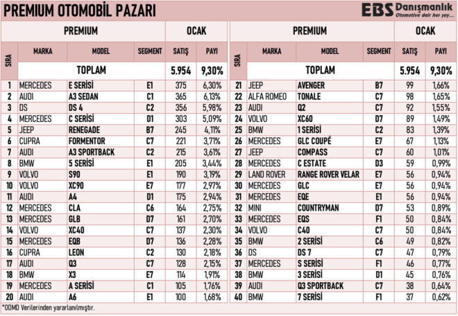 Emre Özpeynirci tarafından burada yapılan paylaşıma göre ocak ayında Türkiye’de en çok satılan lüks otomobil modelleri Mercedes-Benz E-Serisi‘nde yer alan araçlar oldu. Paylaşılan veriye göre E-Serisi’ndeki araçlardan ocak ayında toplam 375 adet satıldı. İkinci sırada 365 satış ile Audi A3 Sedan yer alıyor, üçüncü araç ise 356 satış ile DS imzalı DS 4 modeli oluyor. Listenin devamında sırasıyla Jeep Renegade, Cupra Formentor, Audi A3 Sportback, BMW 5 Serisi, Volvo S90, Volvo XC90 ve Audi A4 gibi araçlar sıralanıyor. Tüm liste ve satış rakamları hemen aşağıda yer alıyor.