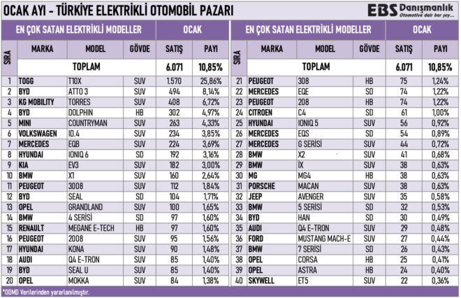 Otomotiv Distribütörleri ve Mobilite Derneği verileri üzerinden ocak ayında Türkiye’de en çok satılan sıfır elektrikli otomobiller listelendi.