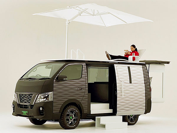 Tam olarak “Nissan NV350 Caravan Office Pod Concept” şeklinde geçen bu konsept, bünyesinde istediğiniz yerde çalışabileceğiniz bir ofis alanı taşıyor. Covid-19 nedeniyle sanal olarak düzenlenen 2021 Tokyo Auto Salon kapsamında görücüye çıkan konsept, direkt NV350 Caravan modeli üzerine kuruluyor. Bir konsept olarak elbette fütüristik tasarım detaylarına sahip olan aracın, ofis alanı olarak planlanan arka kısmı kızaklı şekilde tasarlanmış. Bu kısım fotoğraflarda da görebileceğiniz üzere dışa doğru açılabiliyor. Her türlü yol şartına uygun lastikler üzerine kurulan Nissan Office Pod, üst kısmında ise büyük bir şemsiye altında keyif yapabileceğiniz bir şezlong bulunuyor. Bu aracın gerçek olup olmayacağı henüz bilinmiyor.