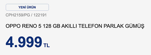 Bunun üstünden çok geçmeden serideki ana model OPPO Reno 5 Türkiye’de satışa sunuldu. Model için büyük bir satış kanalında 128 GB depolamaya özel fiyat 4.999 TL seviyesinde.