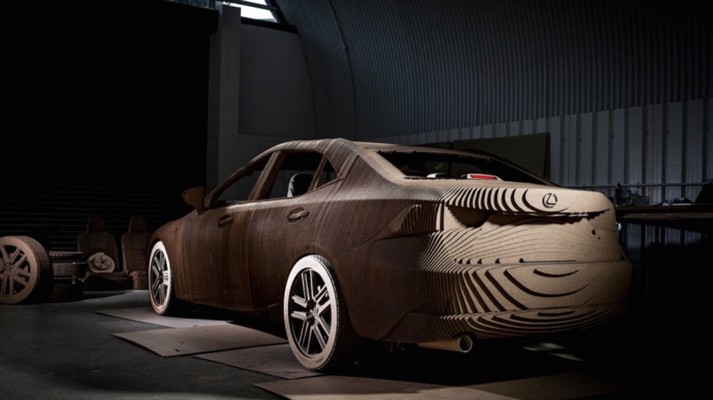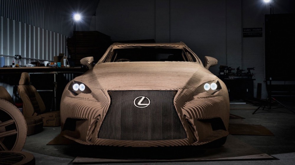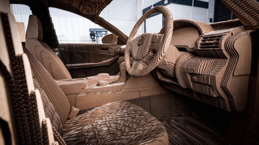 “Otomobil mühendisliği origami sanatıyla buluşursa ne olur?” sorusuna harika bir cevap niteliği taşıyan otomobil, Lexus’un IS sedan modeli üzerine kurulu. Kaputundan jantlarına, koltuklarından direksiyonuna kadar tamamen karton kaplı otomobilin tek “normal” parçası kaputun altında yatan elektrikli motoru. Buradan otomobilin gerçekten sürülebilir bir araç olduğunu anlıyoruz. Öte yandan otomobilin kartondan yapılma değil; bildiğimiz alüminyum ve çelik şasinin üzerine karton kaplanarak geliştirildiğini belirtelim.